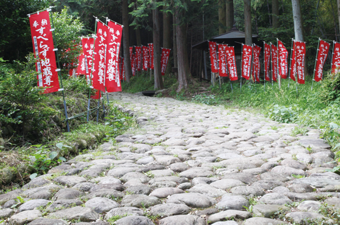 | 金谷坂の途中のすべらず地蔵まで、すべらずにたどり着けるでしょうか?(雨天時の無理は禁物。滑りやすいから)途中の森の中でニホンカモシカが見られることも。 |